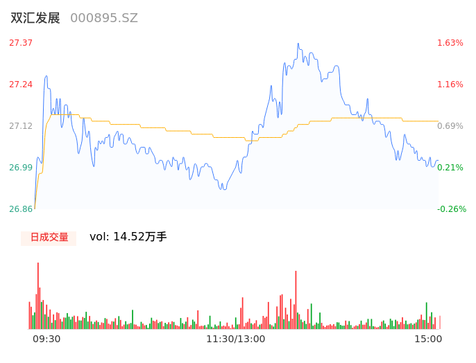 04月16日,双汇发展收报27.01,股价涨幅0.30%,成交金额3.94亿元,换手率0.42%。