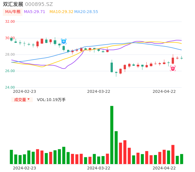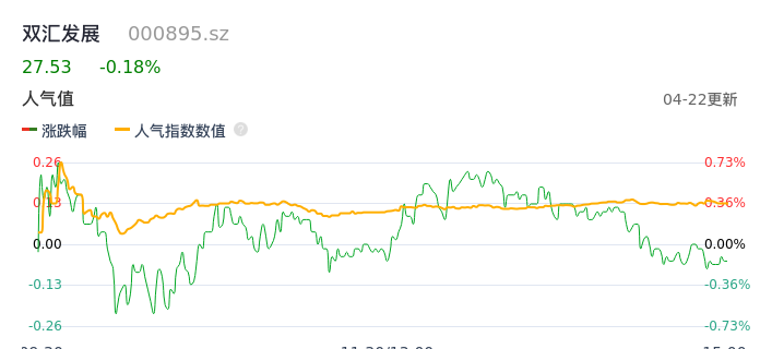 04月22日,双汇发展收报27.53,股价涨幅-0.18%,成交金额2.81亿元,换手率0.29%。
