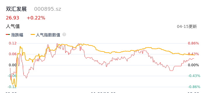 04月15日,双汇发展收报26.93,股价涨幅0.22%,成交金额3.32亿元,换手率0.36%。