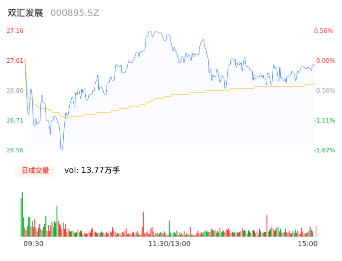 04月17日,双汇发展收报26.99,股价涨幅-0.07%,成交金额3.70亿元,换手率0.40%。