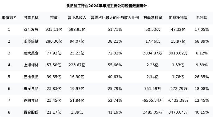双汇发展最新报告期数据为年报,下表汇总了食品加工行业内市值靠前的公司年报主要经营数据
