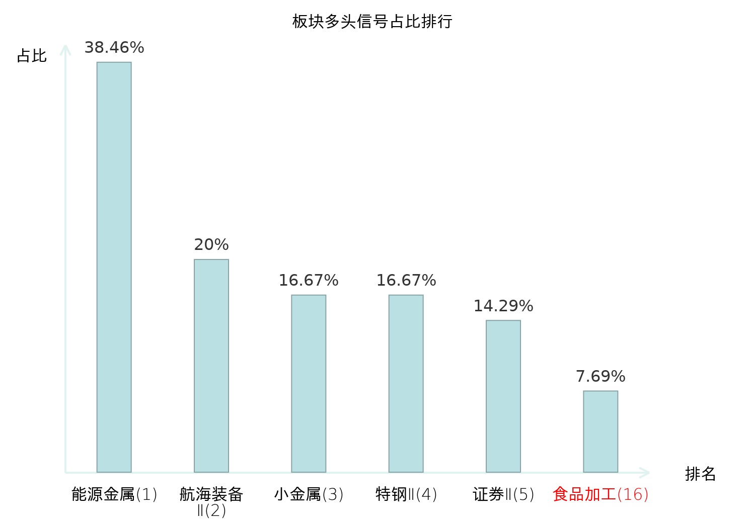 全市场所有行业板块中主力多头信号占比排名中,能源金属板块位居第一。航海装备Ⅱ板块名次提升最快,较昨日上升112位。