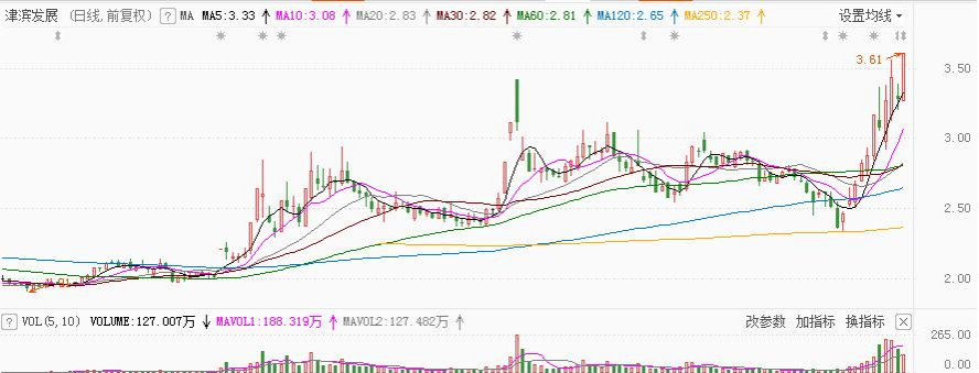 再来看一个定海神针的例子——津滨发展,在下跌途中出现定海神针,此后MACD出现金叉,成交量也开始释放,从其他技术指标的印证中,进一步提高了后市看多的概率: