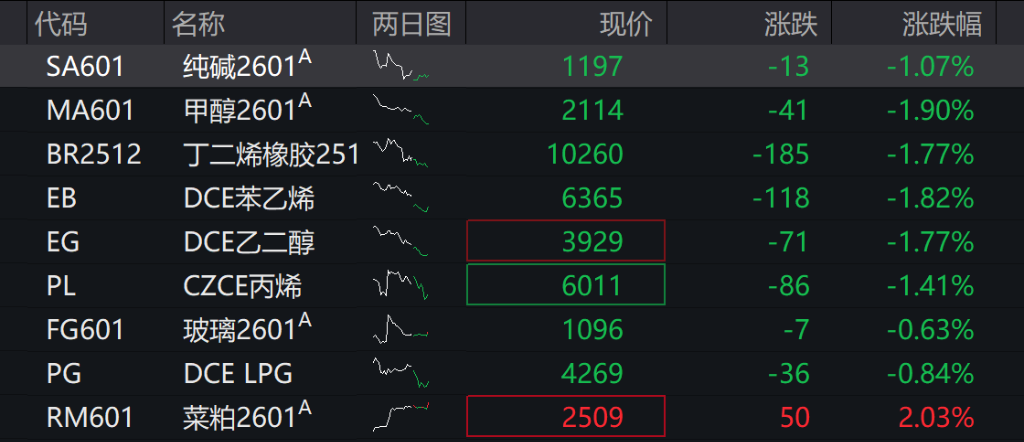 商品期货开盘多数下跌,能化板块领跌,苯乙烯、甲醇主力合约跌超2%,乙二醇、BR橡胶、丙烯等跌超1%;菜籽粕涨超1%,成为早盘少数上涨品种。