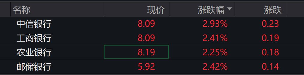 A股银行板块持续走强,厦门银行涨超5%,中信银行、重庆银行、上海银行、兴业银行、招商银行、邮储银行、农业银行、工商银行、江阴银行均涨超2%。