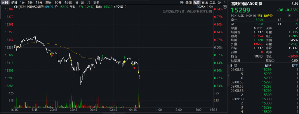富时中国A50指数期货盘初跌0.20%,延续上一交易日夜盘跌势。