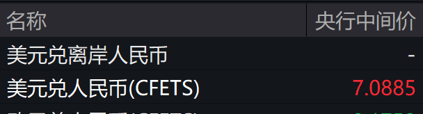 人民币兑美元中间价报7.0885,下调18点;上一交易日中间价7.0867,上一交易日官方收盘价7.1225,上日夜盘报收7.1205。