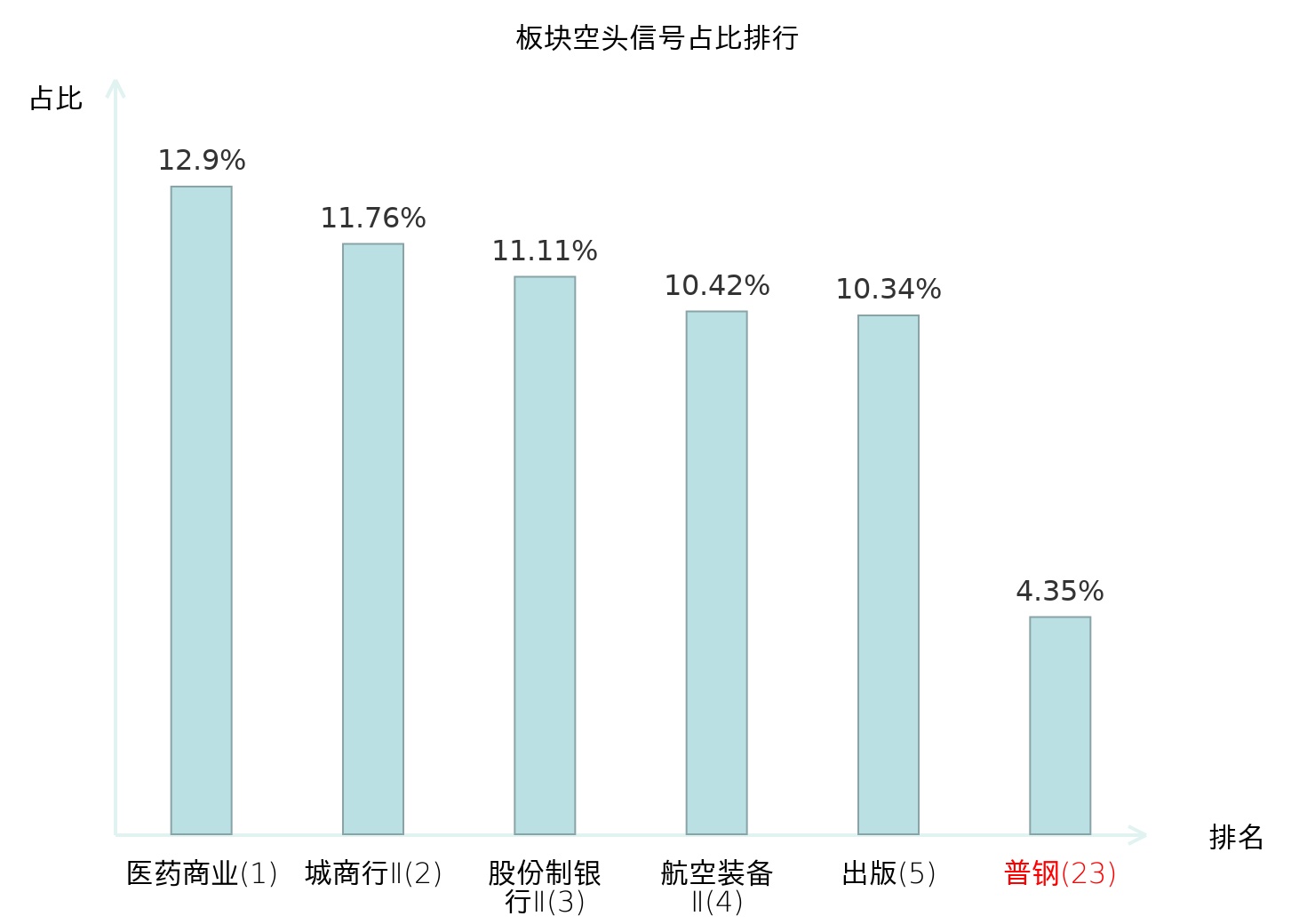 全市场所有行业板块中主力空头信号占比排名中,医药商业板块位居第一。城商行Ⅱ板块名次提升最快,较昨日上升102位。