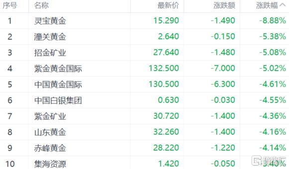 黄金板块大跌,灵宝黄金跌近9%,潼关黄金、招金矿业、资金黄金国际跌超5%,中国黄金国际跌超4%。