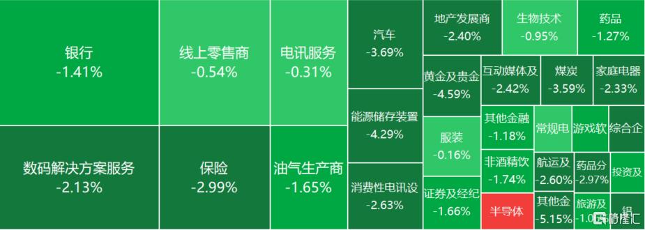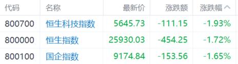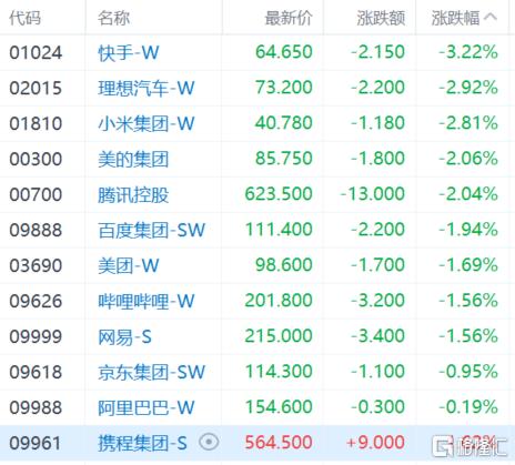 具体来看,大型科技股普跌,快手跌超3%,理想汽车、小米、美的集团、腾讯跌超2%,哔哩哔哩、网易、百度、美团跌超1%,京东、阿里巴巴跌超1%,携程涨1.62%。