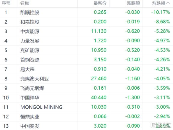 煤炭板块走低,凯顺控股跌超10%,和嘉控股跌超8%,中煤能源跌超5%,力量发展、兖矿能源等跌超4%。