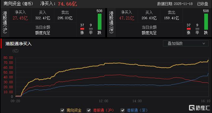 今日,南向资金净买入74.66亿港元,其中港股通(沪)净买入27.45亿港元,港股通(深)净买入47.21亿港元。