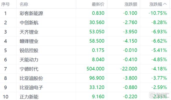 锂电池板块持续走低,彩客新能源跌超10%,中创新航跌超8%,天齐锂业、赣锋锂业跌超6%。
