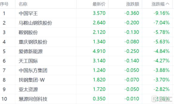 钢铁板块领跌,中国罕王跌超9%,马鞍山钢铁股份跌超7%,鞍钢股份、重庆钢铁股份跌超5%,爱德新能源、天工国际跌超4%。