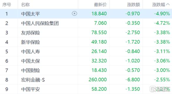 保险板块延续跌势,中国太平跌、中国人民保险集团跌近5%,友邦保险、新华保险、中国人寿跌超3%.