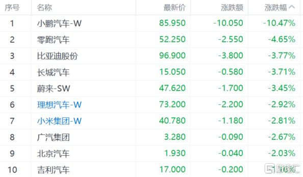新能源车企普跌,小鹏汽车跌超10%,零跑汽车跌超4%,长城汽车、比亚迪股份、蔚来跌超3%。