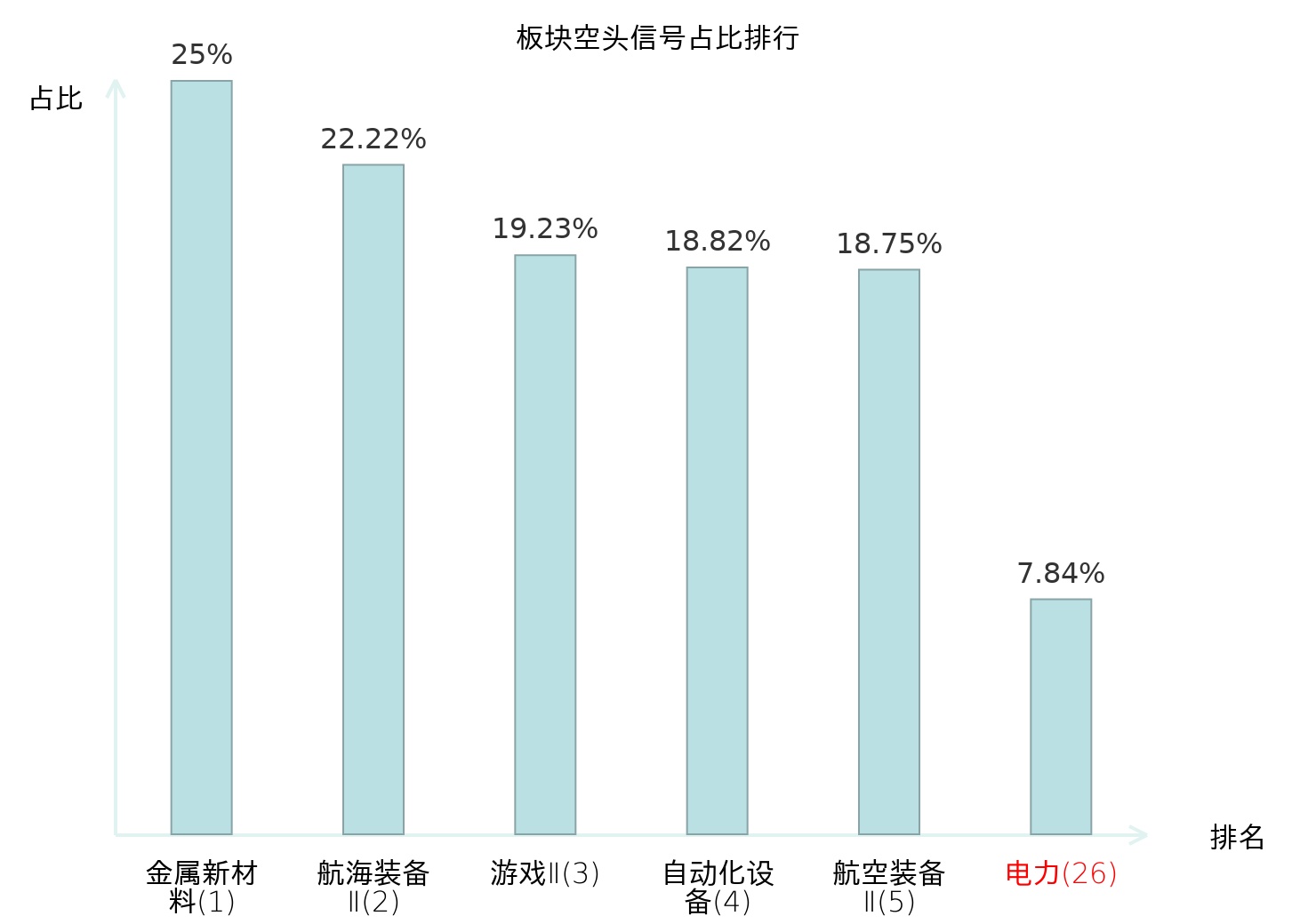 全市场所有行业板块中主力空头信号占比排名中,金属新材料板块位居第一。证券Ⅱ板块名次提升最快,较昨日上升120位。