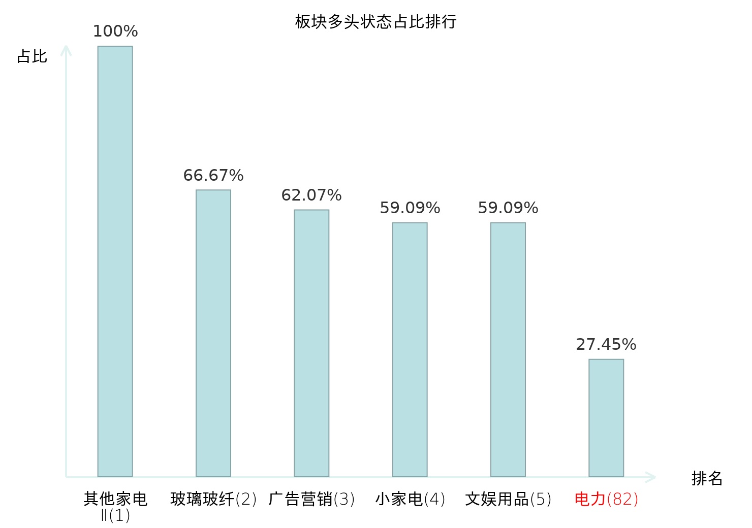 全市场所有行业板块中主力多头状态占比排名中,其他家电Ⅱ板块位居第一。消费电子板块名次提升最快,较昨日上升54位。