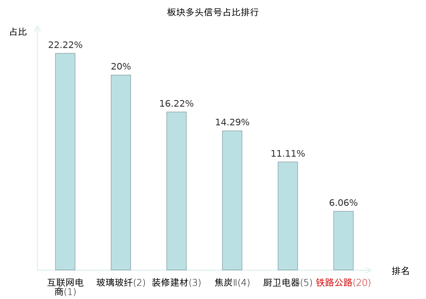 全市场所有行业板块中主力多头信号占比排名中,互联网电商板块位居第一。焦炭Ⅱ板块名次提升最快,较昨日上升118位。