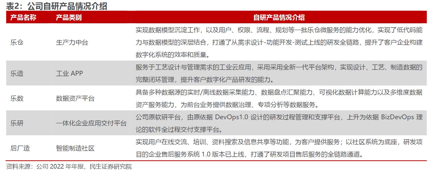 研报菌简评:2021年公司发布了aPaaS、云服务平台及数据平台三类自研产品系列—乐仓生产力中台、后厂造和基于场景的数据治理平台均已上线。