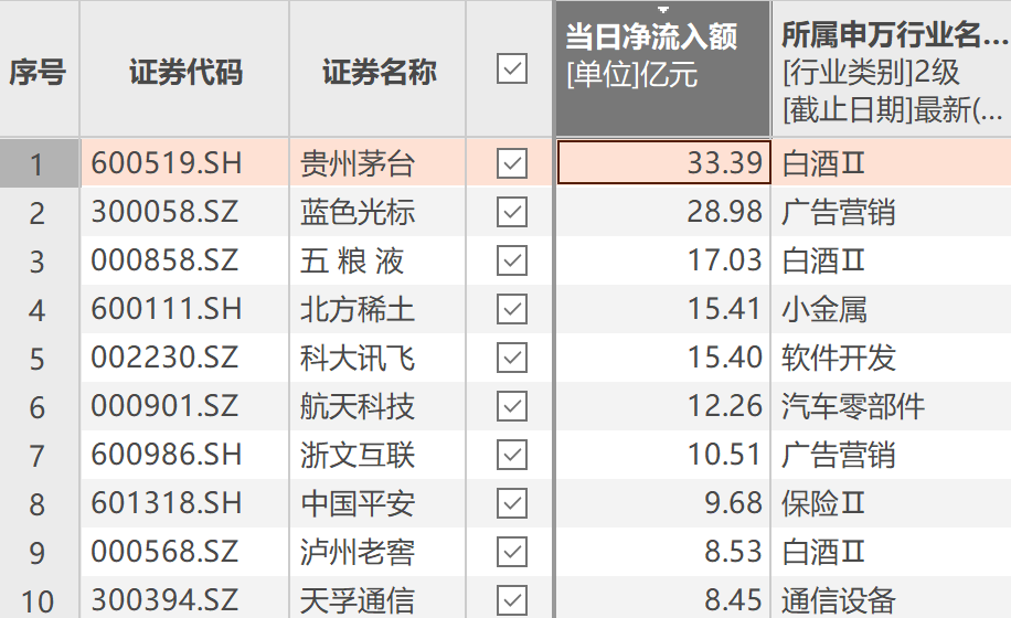 资金风向标 | 贵州茅台、五粮液获大额资金净流入