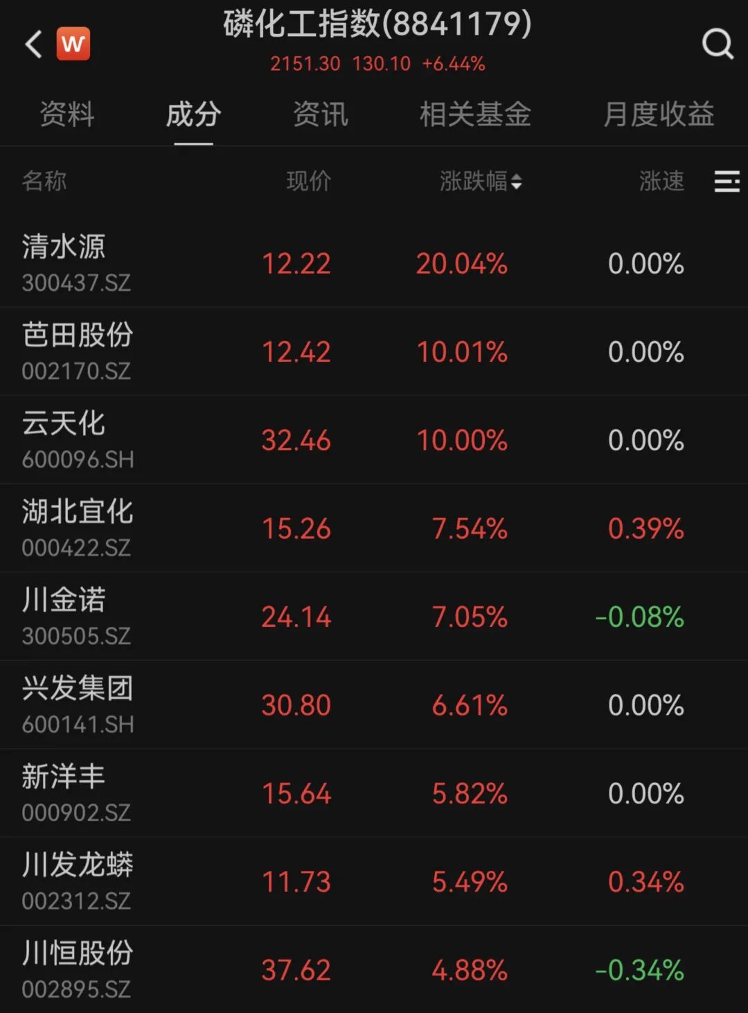 11月6日,A股磷化工板块全线爆发,截至13:30,Wind磷化工指数大涨6.44%,清水源强势斩获20%涨停,芭田股份澄星股份云天化录得10%涨停,湖北宜化川金诺兴发集团新洋丰川发龙蟒川恒股份史丹利等个股跟涨。