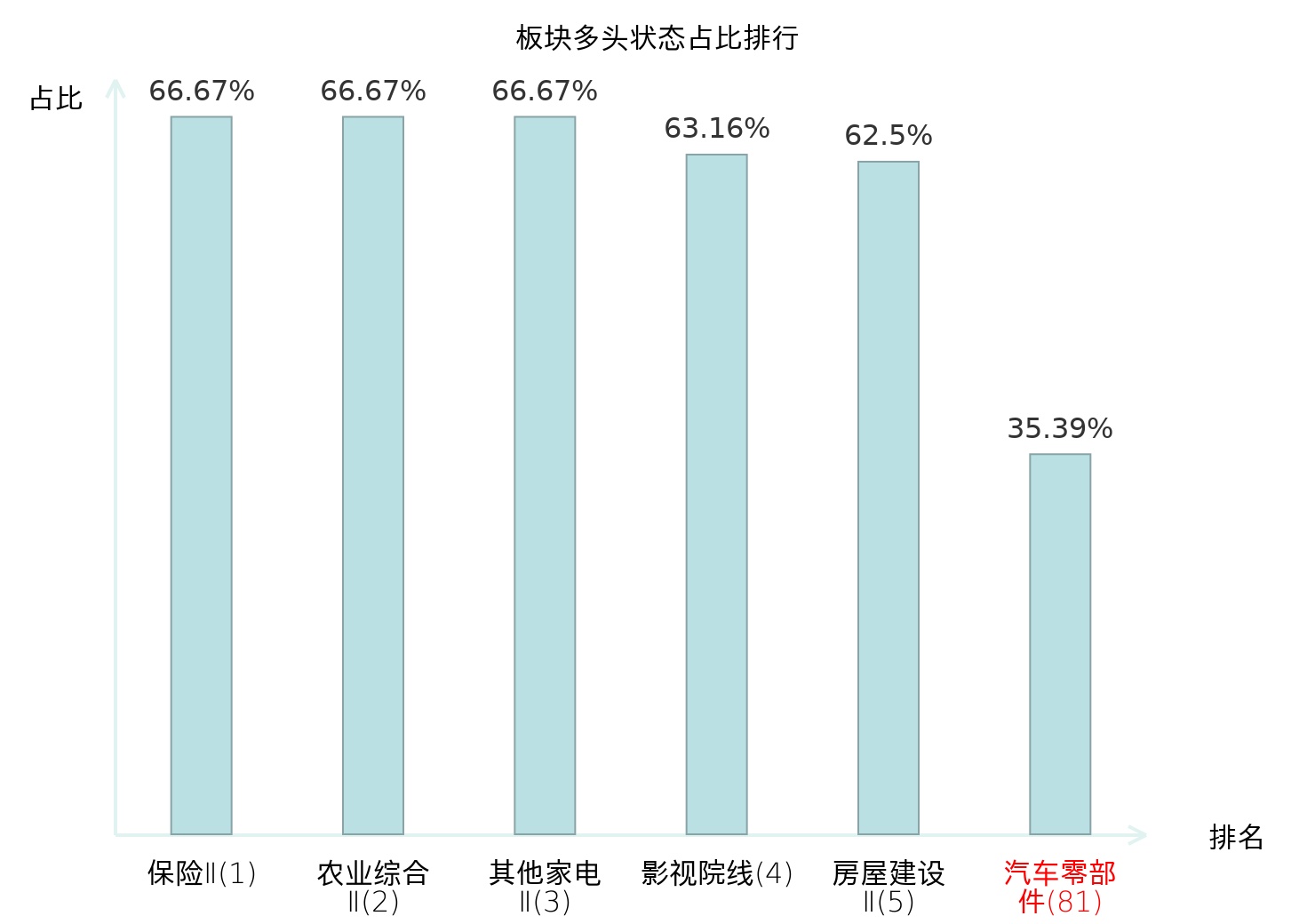 全市场所有行业板块中主力多头状态占比排名中,保险Ⅱ板块位居第一。渔业板块名次提升最快,较昨日上升103位。