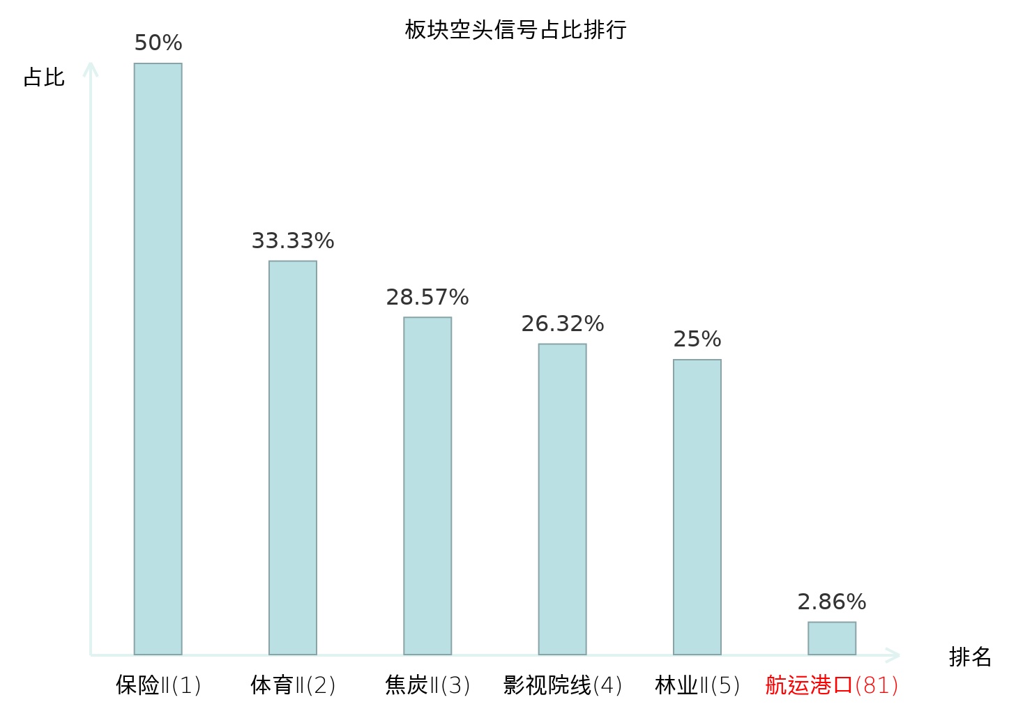 全市场所有行业板块中主力空头信号占比排名中,保险Ⅱ板块位居第一。装修建材板块名次提升最快,较昨日上升118位。