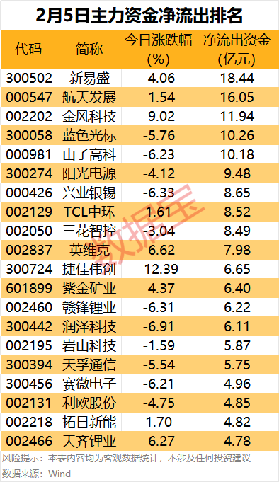 据数据宝统计,86股遭主力资金净流出超2亿元,其中新易盛、航天发展、金风科技、蓝色光标、山子高科遭净流出金额均超10亿元。