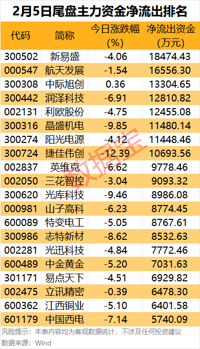 从尾盘净流出来看,新易盛、航天发展、中际旭创、润泽科技、利欧股份等个股净流出均超1亿元。