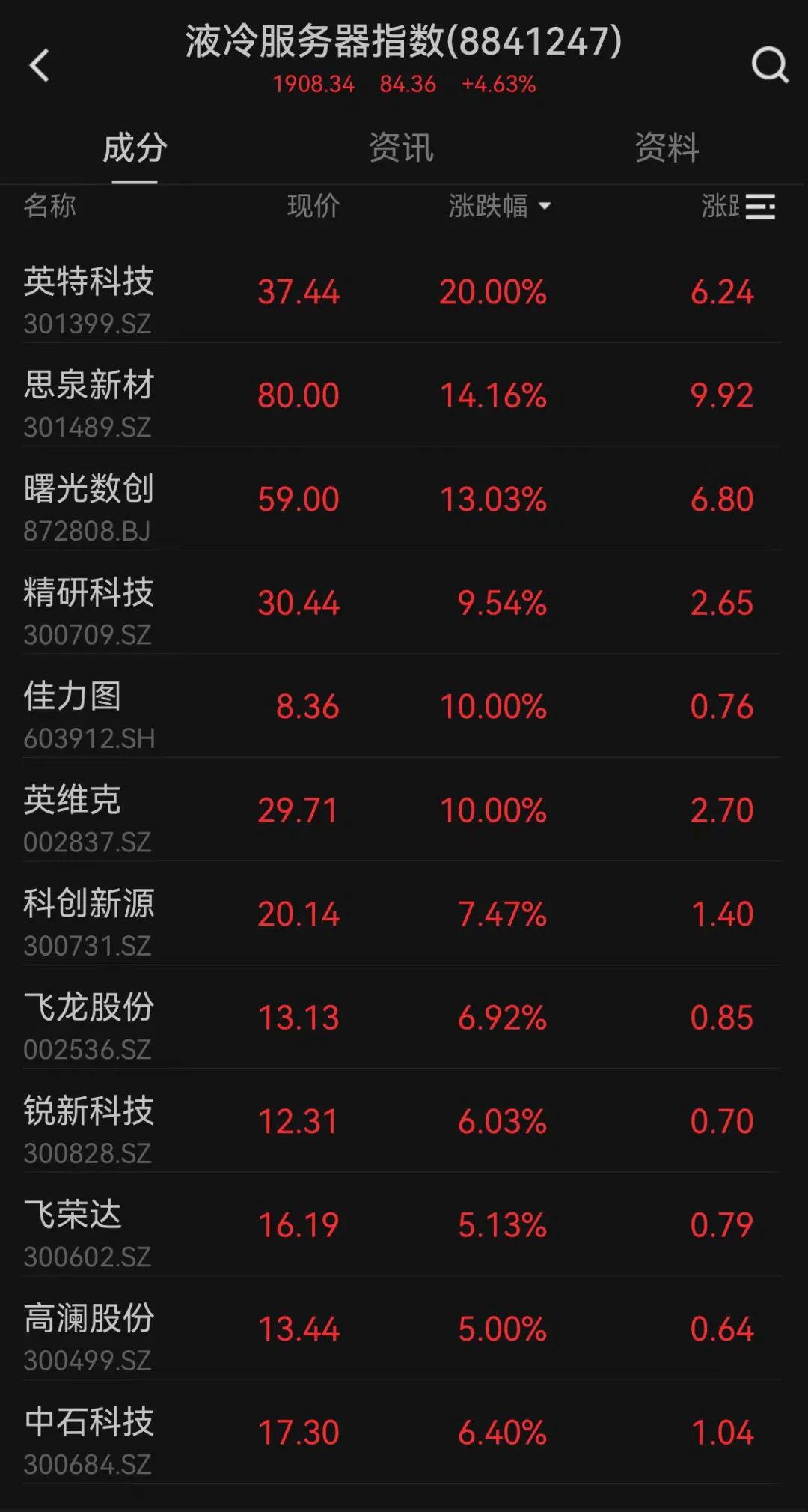 液冷服务器概念高开高走。英特科技拉出20cm涨停,英维克、佳力图涨停,曙光数创、精研科技、飞荣达、高澜股份等多股大涨。