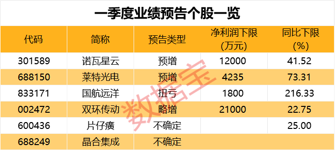 证券时报•数据宝统计,目前共有6家A股公司公布了2024年一季度业绩预告。业绩预告类型来看,4家公司业绩预喜,2家公司预告类型为不确定。