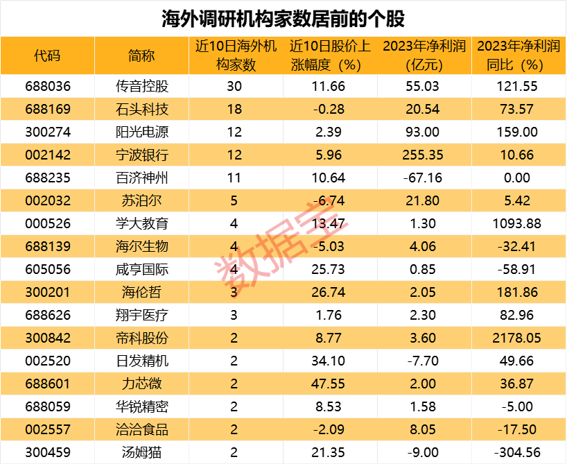 从业绩来看,近日获海外机构关注个股中,有37只股票公布了2023年度业绩预告或快报,净利润规模居前的有宁波银行、阳光电源、晶科能源、传音控股,净利润同比增幅居前的有帝科股份、焦点科技等。