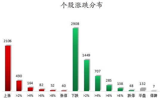 个股涨跌情况,截至收盘,沪深两市合计2106只个股上涨,2908只个股下跌,平盘个股132只,停牌的个股7只。不含当日上市新股,共有40只个股涨停,48只个股跌停。