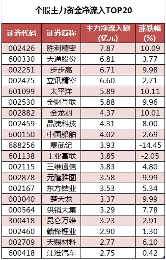 个股来看,今日有1783只个股获主力资金净流入,其中,57股获主力资金净流入超1亿元。胜利精密主力资金净流入最多,净流入金额为7.87亿元;主力资金净流入居前的个股还有天通股份、步步高、立讯精密、太平洋、金财互联等,净流入金额分别为6.81亿元、6.71亿元、6.6亿元、5.89亿元、5.88亿元。