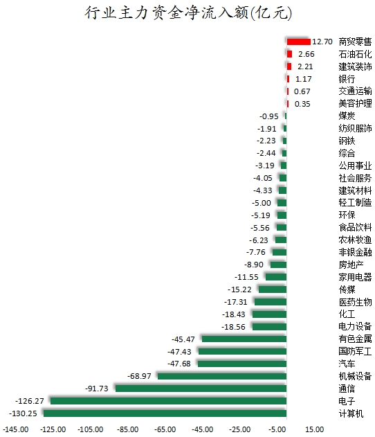 从行业来看,申万所属的31个一级行业,今日有6个行业主力资金呈现净流入,其中,商贸零售行业主力资金净流入最多,净流入金额为12.7亿元;行业主力资金净流入居前的还有石油石化、建筑装饰等,净流入金额分别为2.66亿元、2.21亿元。25个行业主力资金呈现净流出,其中,计算机行业主力资金净流出最多,净流出金额为130.25亿元;行业主力资金净流出靠前的还有电子、通信、机械设备、汽车、国防军工、有色金属等,净流出金额分别为126.27亿元、91.73亿元、68.97亿元、47.68亿元、47.43亿元、45.47亿元。