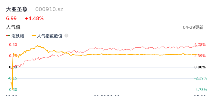 04月29日,大亚圣象收报6.99,股价涨幅4.48%,成交金额5336.34万元,换手率1.42%。