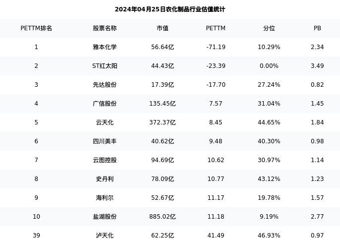 从估值角度看:泸天化最新市盈率PETTM为41.49,在行业内排名37/57,处于46.93分位。