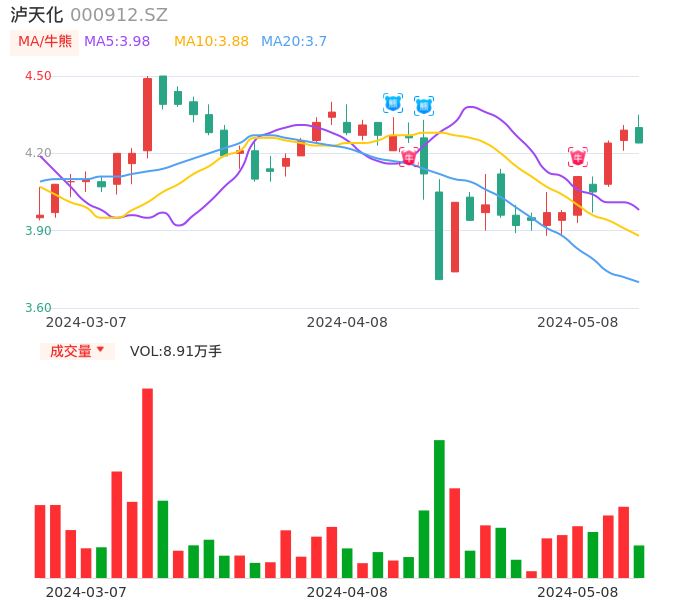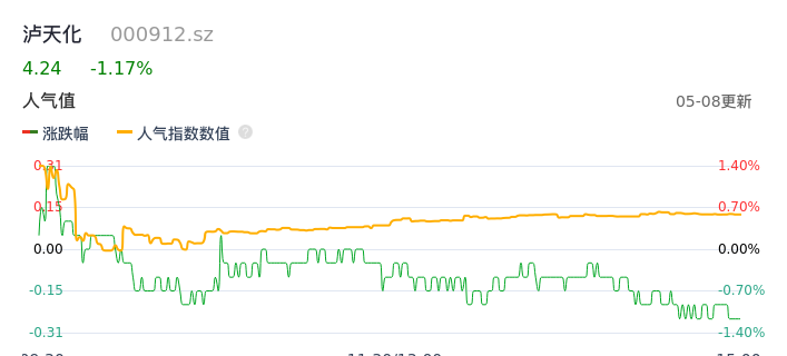 05月08日,泸天化收报4.24,股价涨幅-1.17%,成交金额3816.61万元,换手率0.57%。