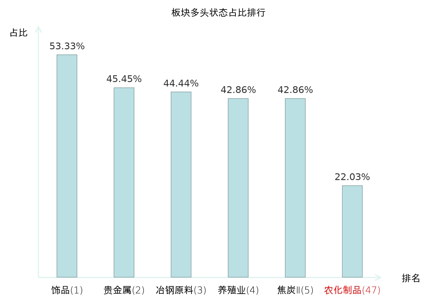 全市场所有行业板块中主力多头状态占比排名中,饰品板块位居第一。非金属材料Ⅱ板块名次提升最快,较昨日上升58位。