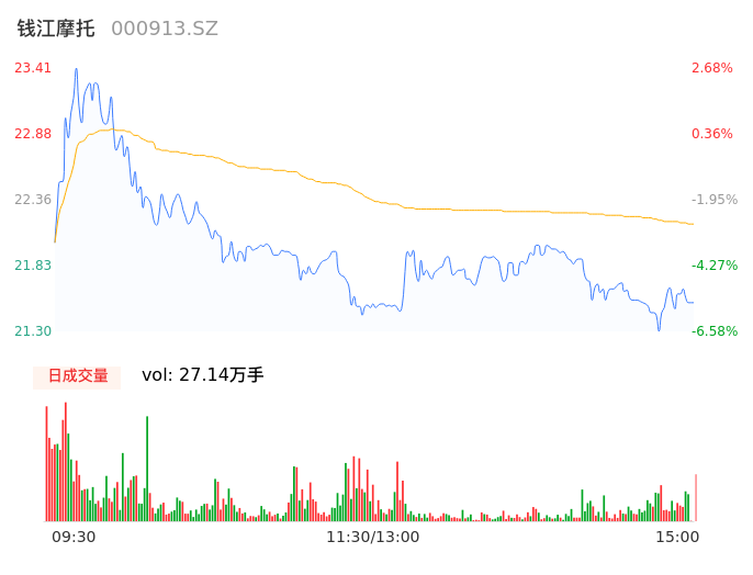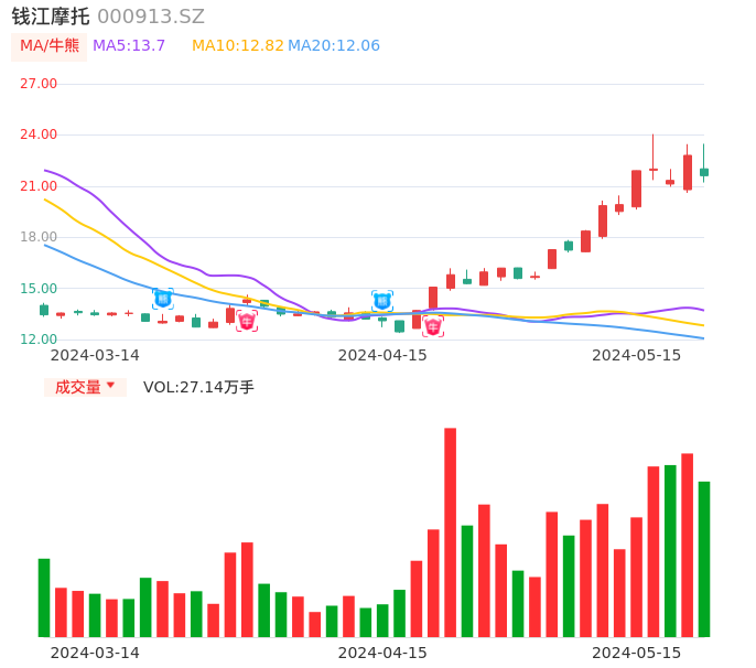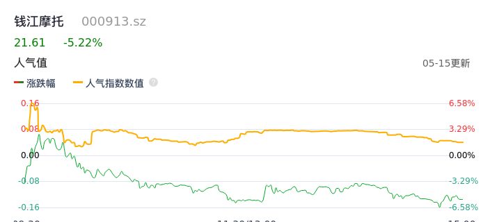 05月15日,钱江摩托收报21.61,股价涨幅-5.22%,成交金额6.01亿元,换手率5.94%。