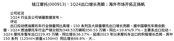 值得注意的是:2024年05月中金公司的常菁/丁健/邓学/陈显帆/陈雅婷分析师,首次发布关于钱江摩托的研究报告,标题为:钱江摩托(000913):1Q24出口增长亮眼;海外市场开拓正扬帆。