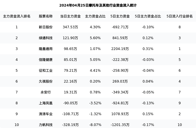 从主力资金流向来看,摩托车及其他行业今日主力资金流入6.69亿元,在所有申万二级行业中排名:93/131。