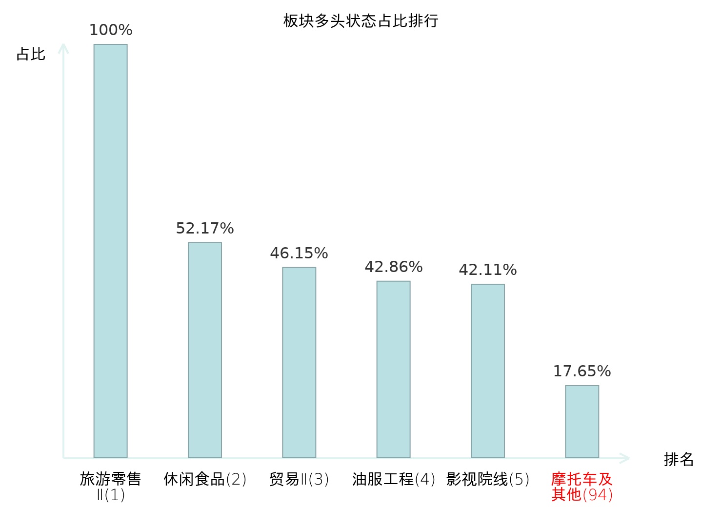 全市场所有行业板块中主力多头状态占比排名中,旅游零售Ⅱ板块位居第一。体育Ⅱ板块名次提升最快,较昨日上升99位。
