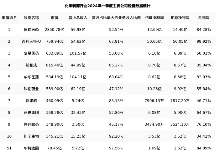 华特达因最新报告期数据为一季度,下表汇总了化学制药行业内市值靠前的公司一季度主要经营数据