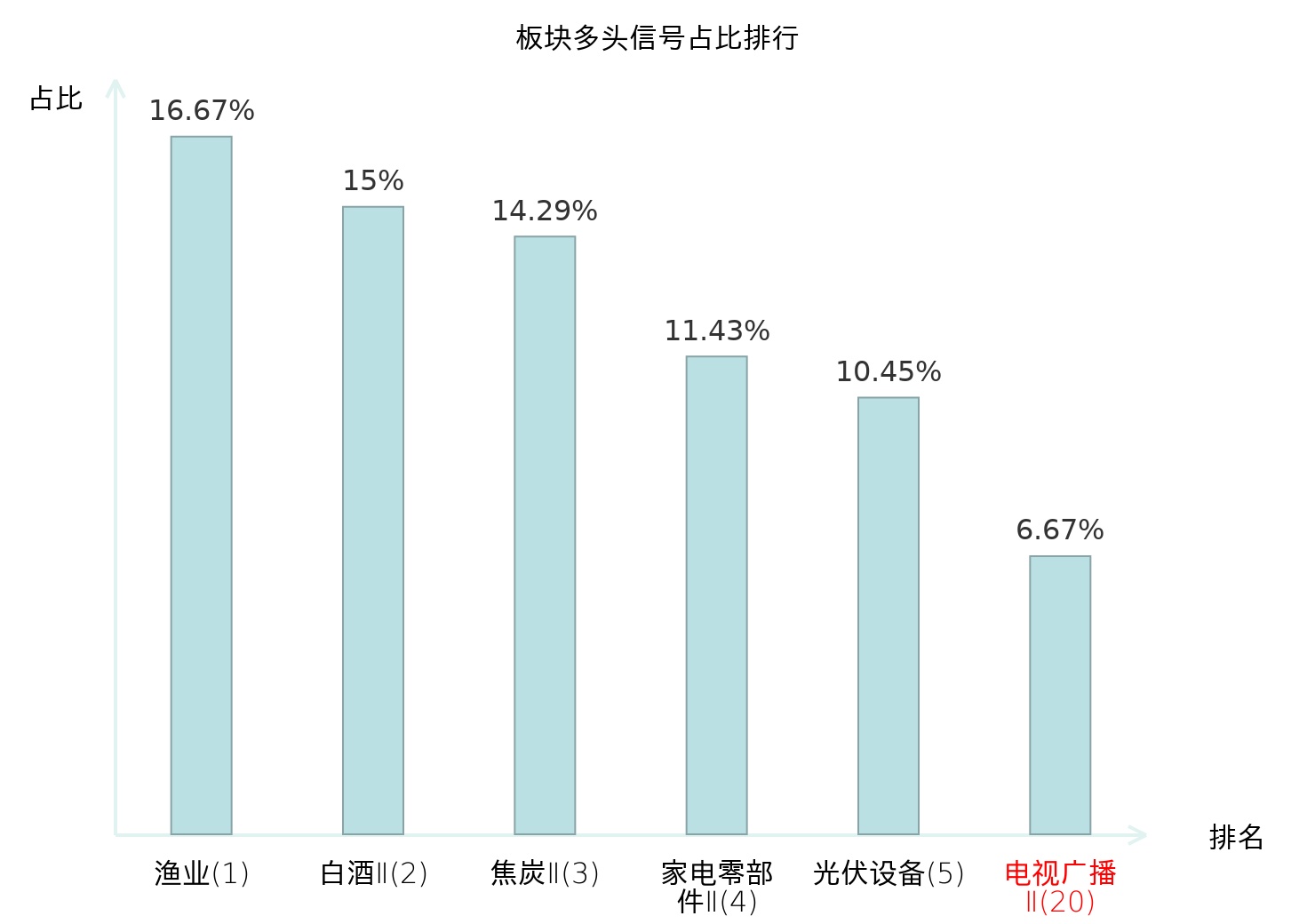 全市场所有行业板块中主力多头信号占比排名中,渔业板块位居第一。黑色家电板块名次提升最快,较昨日上升111位。