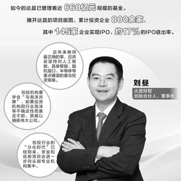 2000年,刘昼怀揣电广传媒给的1亿元启动资金创立达晨,投身创投赛道。转眼25年,如今的达晨已管理着近660亿元规模的基金。摊开达晨的项目版图,累计投资企业800余家,其中145家企业实现IPO,约17%的IPO退出率,是其亮眼业绩的核心指标。从早期聚焦“规模化、盈利性”等因子的投资逻辑,到当下更看重“研发转化率、战略意义”的科技新生态,达晨似乎都能“先行半步”。