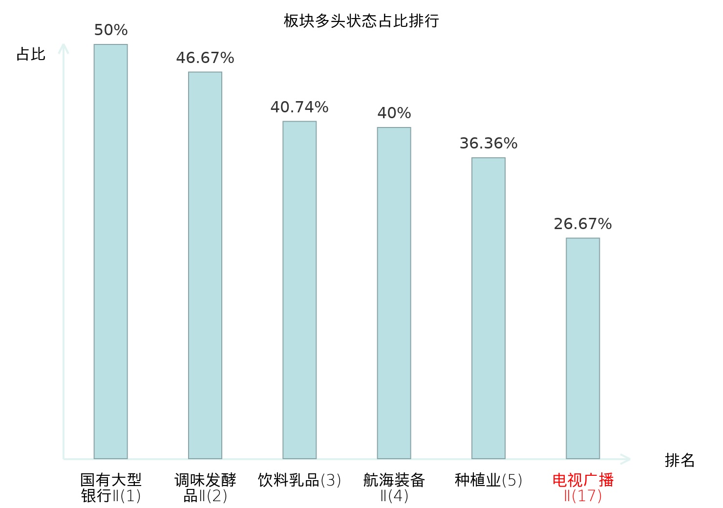 全市场所有行业板块中主力多头状态占比排名中,国有大型银行Ⅱ板块位居第一。金属新材料板块名次提升最快,较昨日上升71位。