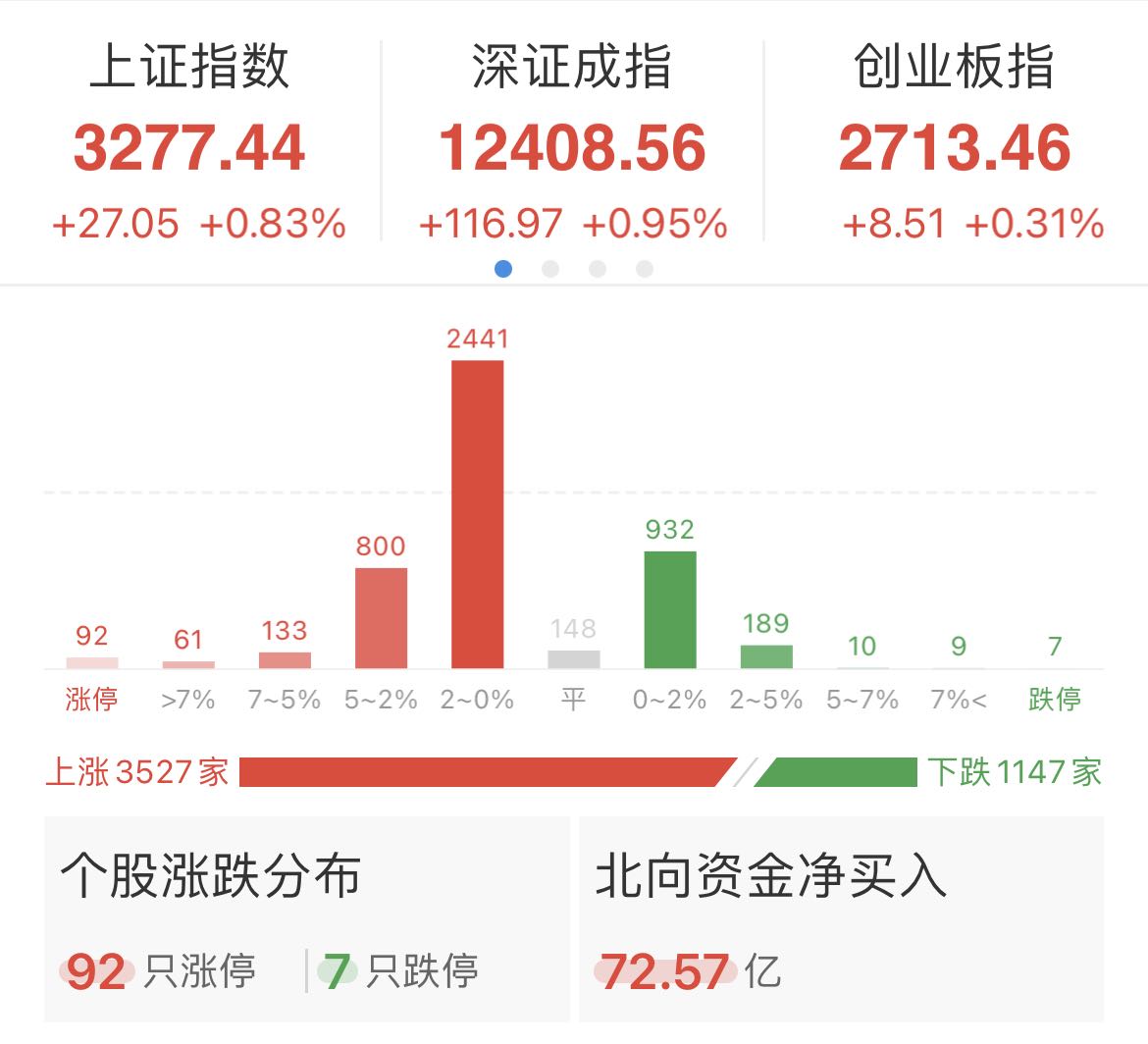 【7月26日】今日周二,三大指数均小幅上涨,其中大盘全天呈现震荡走高之势,并将昨日下跌阴线反包,美中不足的是今日量能再度萎缩。午后三大指数涨幅回落,创业板指一度转绿,医药医疗板块整体较为弱势。截至收盘,上证指数报3277.44点,涨幅0.83%,成交额为3344亿元;深证成指报12408.56点,涨幅0.95%,成交额4997亿元;创业板指报2713.46点,涨幅0.31%,成交额1581亿元!!