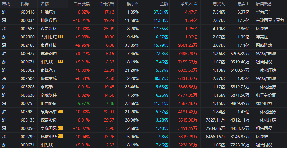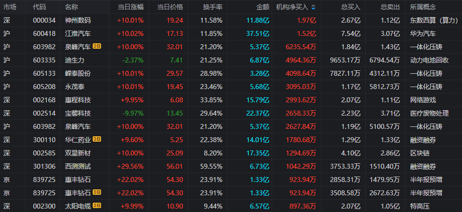 今日龙虎榜整体比起上个交易日,活跃度有所复苏,一般情绪冰点之后都会迎来小幅复苏,但两市合计成交量继续略微走低,跌破万亿。同时,今日惠程科技等多只题材股反核,把人气略微提升了一下。而从今日总净流入的榜单上来看,净流入超过1亿元有3家,比上个交易日增加3家,其中榜单第一名为江淮汽车,该股题材主要为汽车整车,类比于长安汽车。7月21日,由百度与央视新闻联合举办的2022百度世界大会在线上召开,百度将部署上万辆无人驾驶汽车,公司与百度合作推出无人驾驶汽车。公司是一家集商用车、乘用车及动力总成研发、制造、销售和服务于一体的综合型汽车厂商。另外,今日龙虎榜总榜净流入前三的个股分别是江淮汽车、神州数码和双星新材,所代表的行业热点分别为汽车整车、东数西算(数字经济)和OLED区块链,市场资金指向意义不明,主要原因还是大家都在博弈等待本周召开的重要会议。
